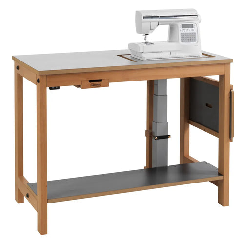 Sjöbergs symaskinsbord med inbyggd symaskinshiss minimerar skador på symaskinen. Dessutom slipper man all tung hantering som uppstår när man måste flytta undan symaskinen för att få fri arbetsyta.